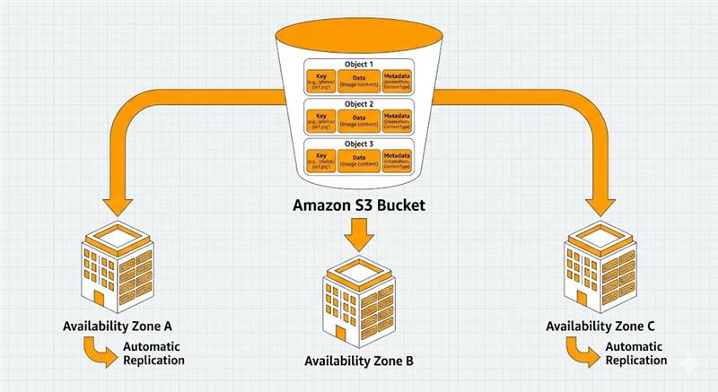 When you upload data to S3, AWS doesn't just save it once. The service automatically replicates objects across multiple Availability Zones within your chosen region. This architecture delivers: