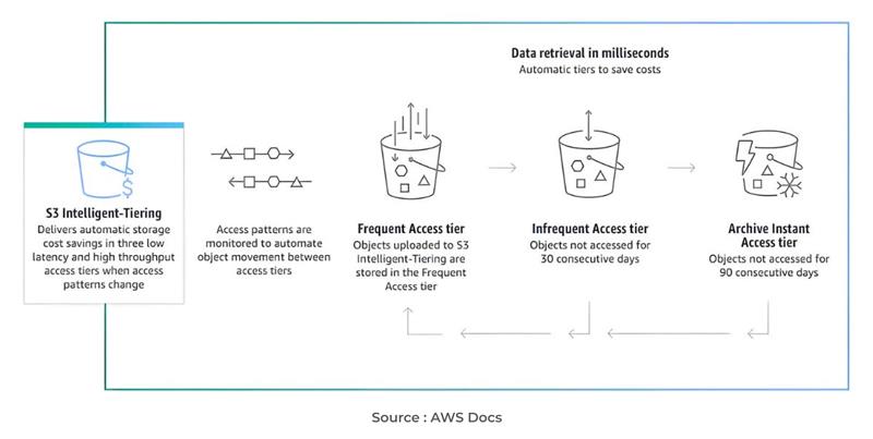 Amazon S3 Intelligent-Tiering is a superb tool, S3. It tracks the access patterns of your objects and automatically moves data between a frequent access tier and a far less expensive infrequent access tier. When an object in the infrequent tier is accessed, it is transferred back to the frequent tier, now it offers many classes based on your requirements. It has a small per-object monitoring fee, which in nearly all cases is cheaper than hand-managing lifecycle policies in data whose access patterns are uncertain.