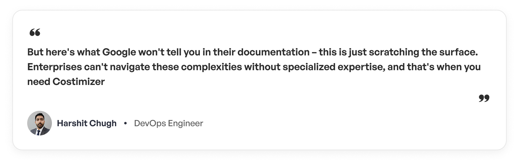 But here's what Google won't tell you in their documentation – this is just scratching the surface. Enterprises can't navigate these complexities without specialized expertise, and that's when you need Costimizer.